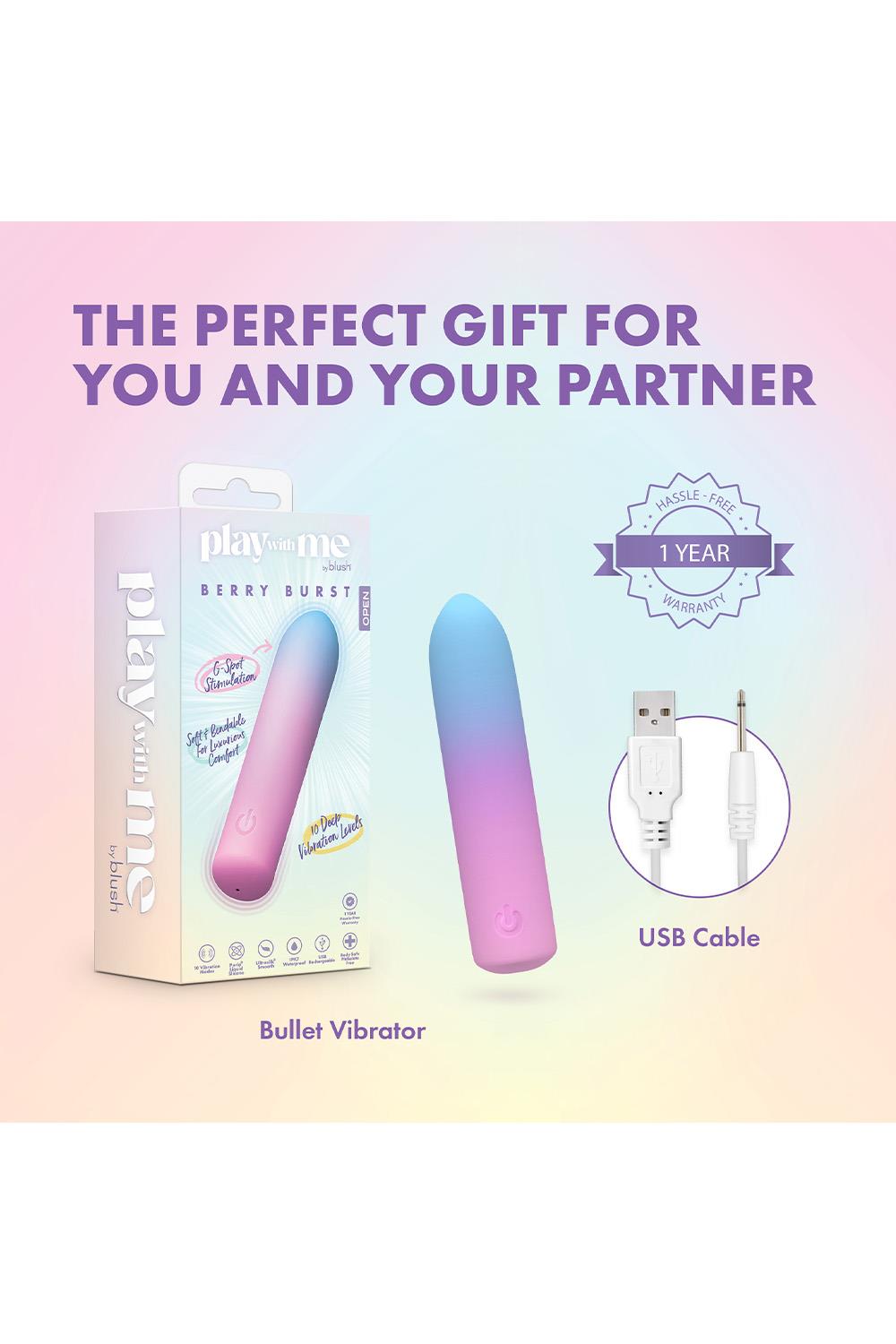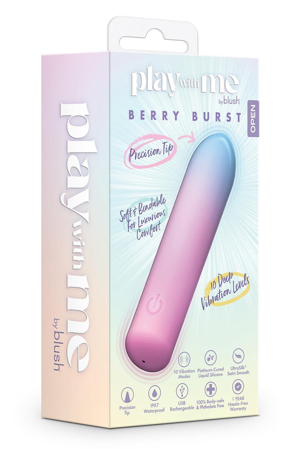 Revel in the radiant pleasure of Play With Me’s Berry Burst, a petite powerhouse that turns every touch into sweet indulgence. Designed for playful pleasure, this adorable, pocket-sized vibrator reveals 10 deep yet quiet vibration modes, with a precision tip for targeted sensations, guiding you to moments of pure bliss. Whether it’s slow, seductive foreplay, pinpoint clitoral stimulation, or sensual nipple pleasure, Berry Burst delivers focused vibrations exactly where you crave them most. Explore a range of sensations, from gentle pulses to deep, resonant thrills, to discover your ultimate pleasure points. Crafted from Blush’s Purio® platinum-cured liquid silicone, the vibrator’s lusciously soft and bendable design ensures sweet and customizable pleasure. Its IPX7 waterproof rating ensures adventurous play, and USB charging adds convenience. Experience the vibrant joy of Berry Burst and let every touch delight your senses, whisking you away to a world of sensual indulgence.