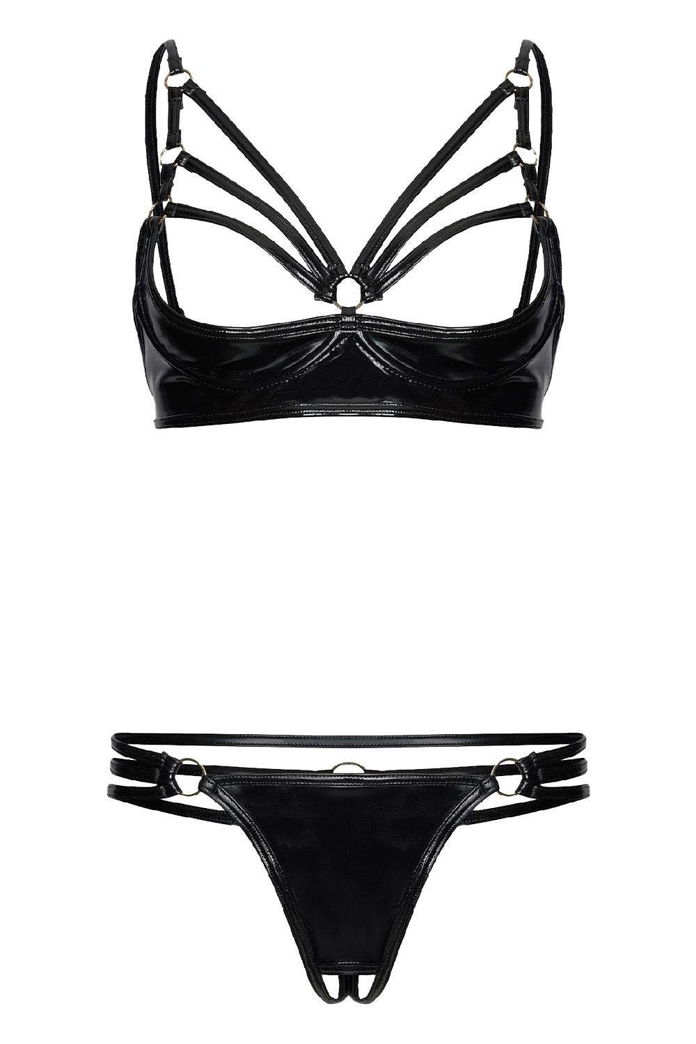 The strappy half-cup bra artfully frames the bust, offering visual intrigue and a supportive yet revealing fit. Paired with a matching open-crotch string, this set is crafted to contour the body, enhancing natural curves while leaving a lasting impression.