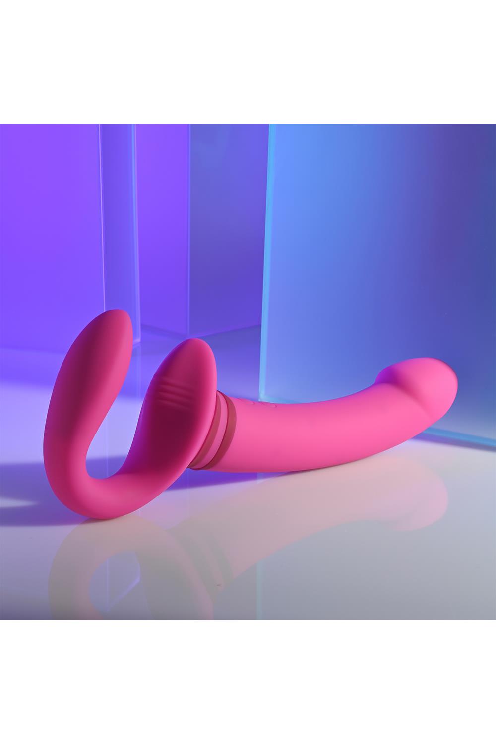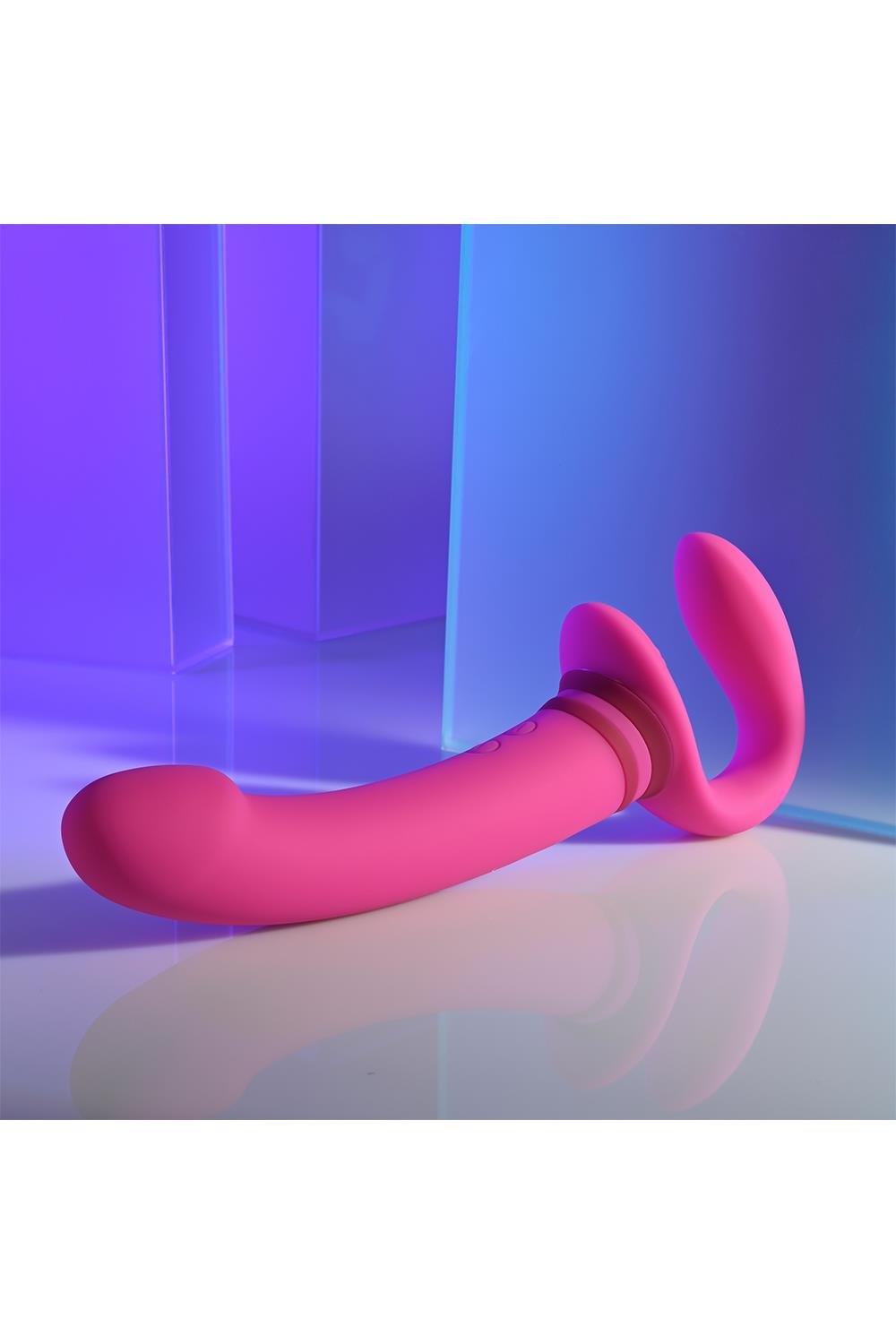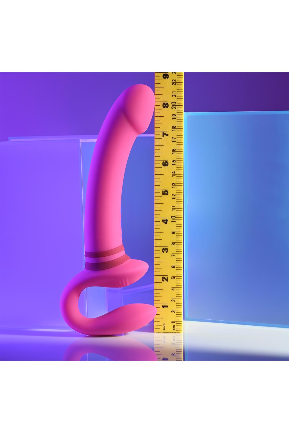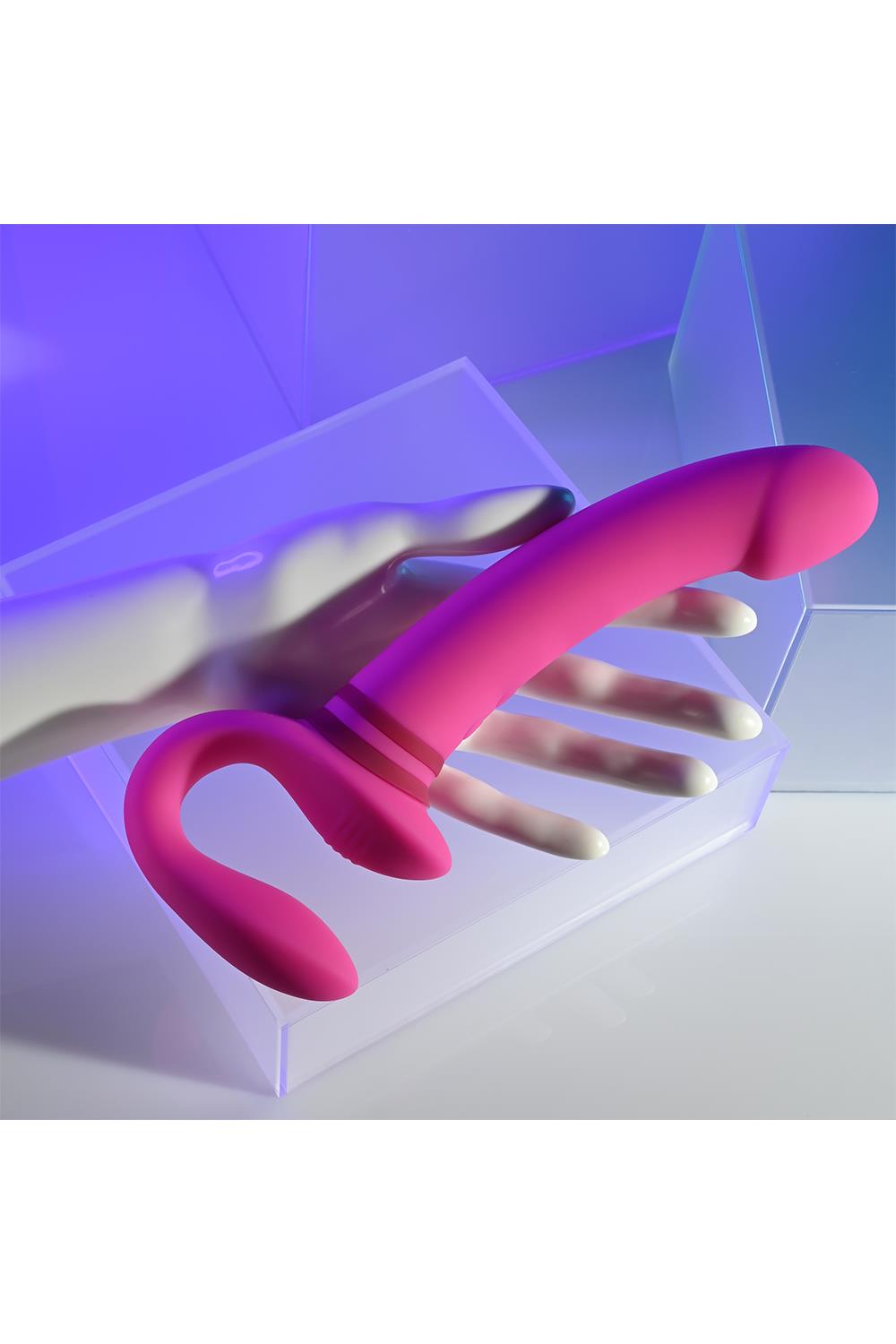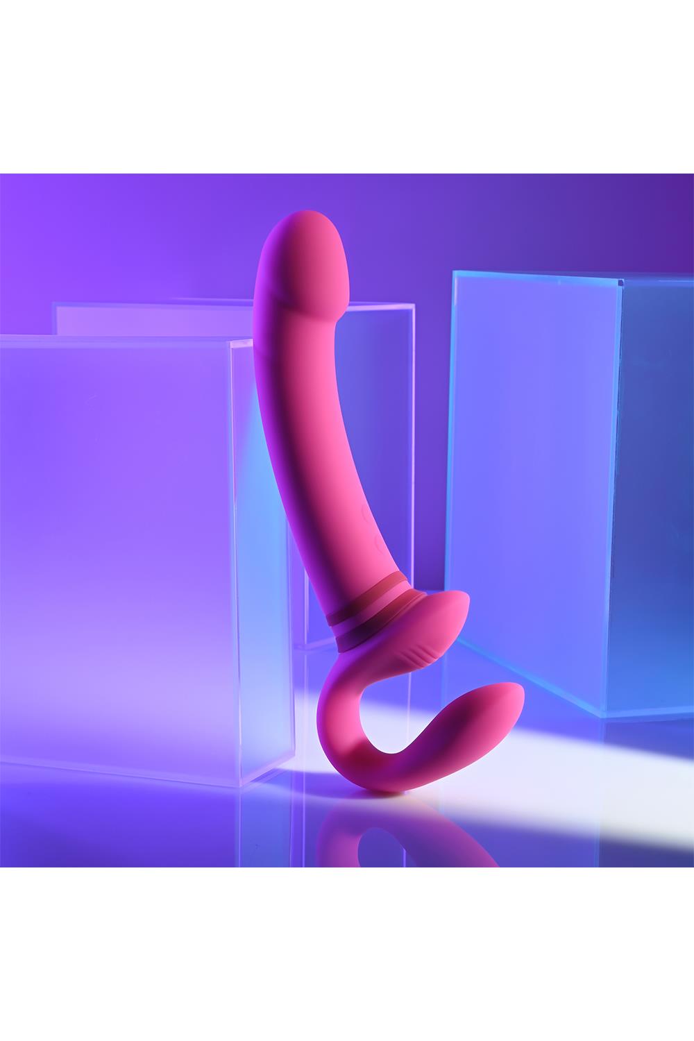 This unique double-ended toy features a tall, gently-arched main shaft with a crowned tip on one side, and a flexible ‘wearable’ C-shape on the other side. Each end has its own independently controlled motor to increase pleasure possibilities, even under water as it’s completely submersible.