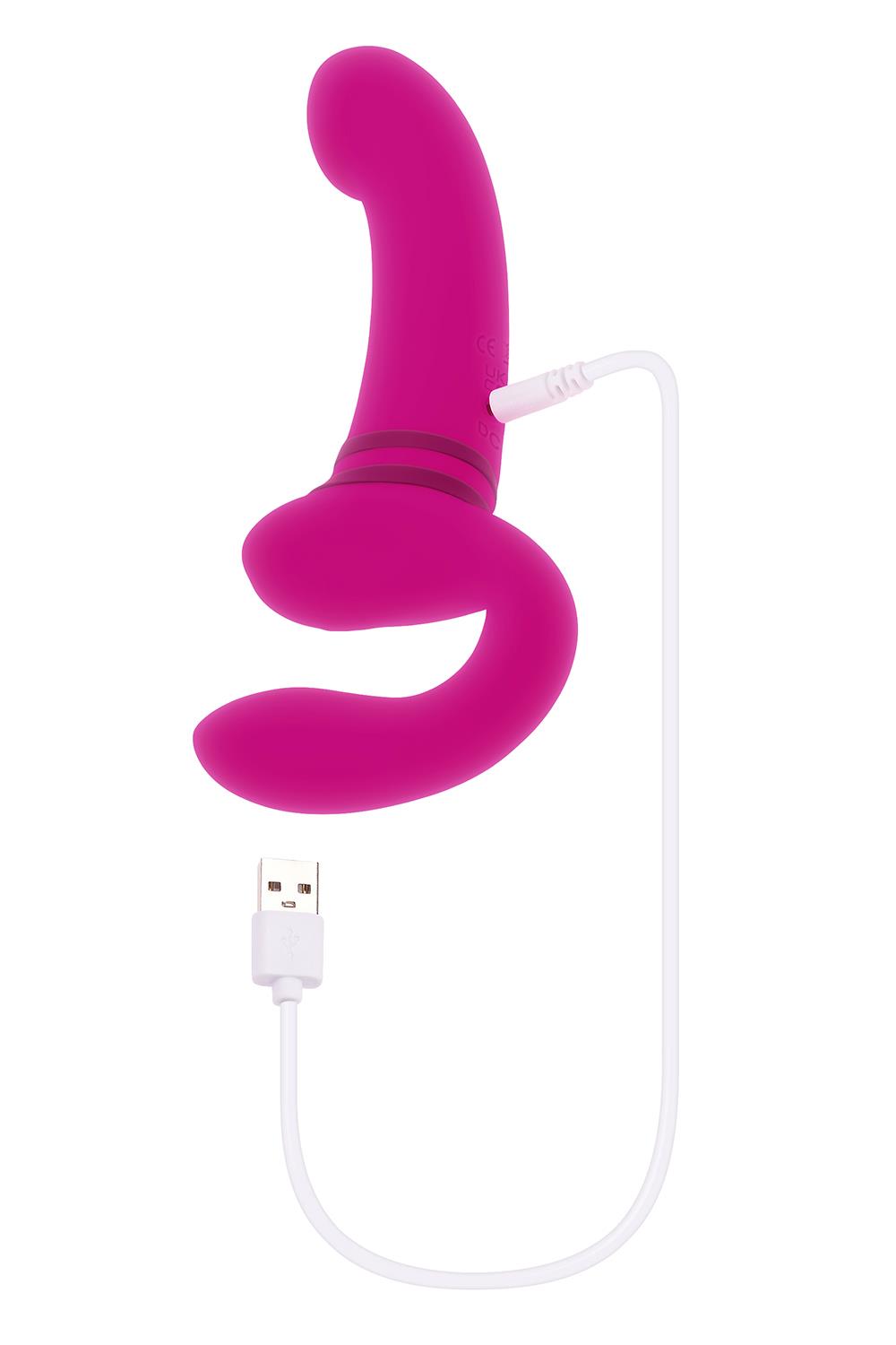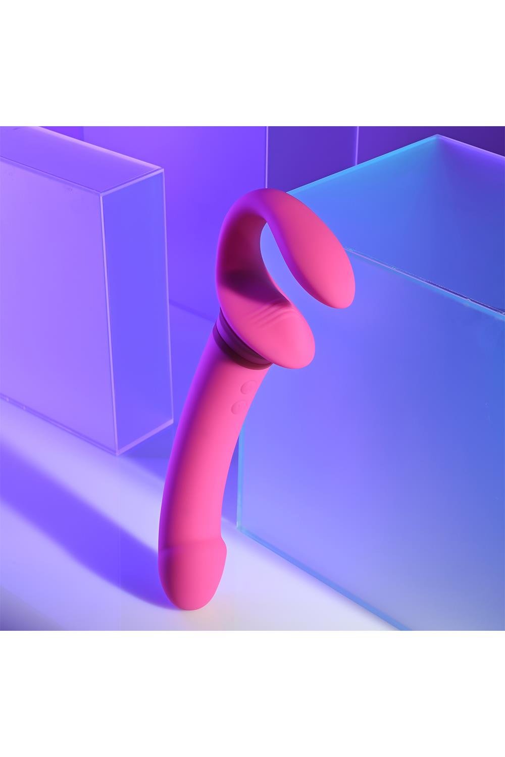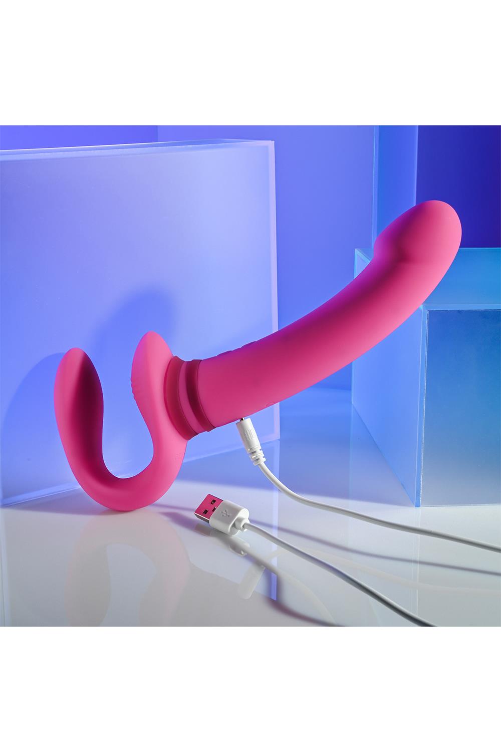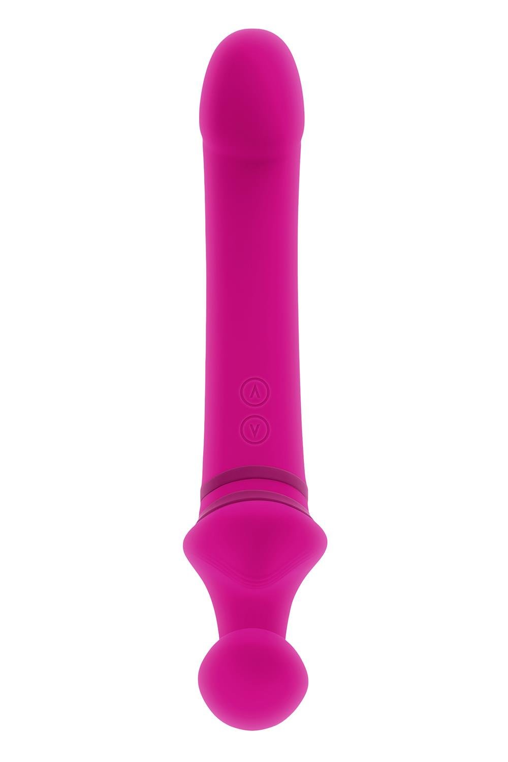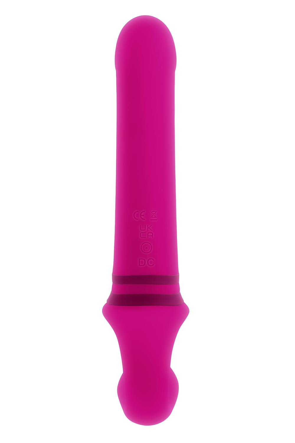 This unique double-ended toy features a tall, gently-arched main shaft with a crowned tip on one side, and a flexible ‘wearable’ C-shape on the other side. Each end has its own independently controlled motor to increase pleasure possibilities, even under water as it’s completely submersible.